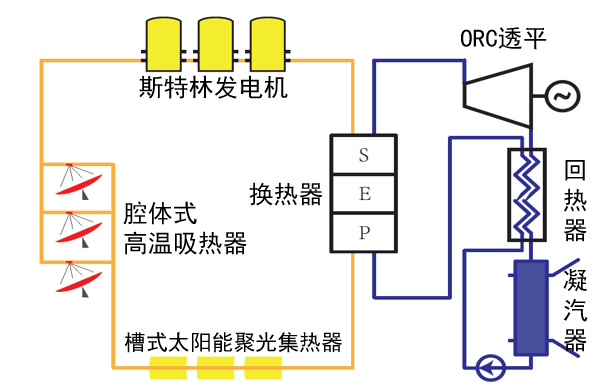 ? ? ? 基于能量梯級收集和能量梯級利用的思想,提出了一種新型的發(fā)電系統(tǒng)。系統(tǒng)耦合了碟式高溫集熱器和槽式中溫集熱器,以及利用高溫?zé)嵩吹乃固亓职l(fā)電機和低溫?zé)嵩吹挠袡C工質(zhì)朗肯循環(huán)(ORC)發(fā)電機。?